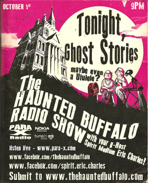 thb-GhostStoriesIII_300In this episode, you’ll be ‘treated’ to a few throwback  moments of my then 3 year old trick-or-treating, followed by true stories of the unknown from Jake in Buffalo, NY who has seen shadows at his grandfathers house! You’ll be moderately traumatized by Michelle from Franklinville, NY, who, Ouija board in hand, apparently released the Kraken in a local haunted cemetery. You’ll be somewhat muffled, hearing Jennifer from Connecticut talk about her Grandfather, saving her from beyond the grave! You’ll be uncomfortably numb, listening to another Michelle, this time from Fort Erie, Ontario Canada, talk about her haunting experience! Next you’ll get petered out by Pete’s tale of a haunted recording studio in Cleveland, OH! But WAIT, there’s more! The second half is a retro interview that I did for 91.3FM/WBNY. In that I try to explain more of what The Haunted Buffalo is all about, because not only is it a radio show, but it’s also part of a monopoly of music/design/photography/merchandise and more, all based within the common theme of “I don’t know what the heck just happened”. Soooo, pull up a tombstone, tune in to THB for the next hour or so, and let your worries pile up fast, listening to the horrible situations that happen to people. Just don’t forget about the muffins in your oven. As always, if you have a story to submit, please email me at thehauntedbuffalo@gmail.com BE A PART OF IT!